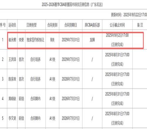 现在崔永熙正在东莞进行康复训练,他肯定会出战下赛季。之前已经确定崔永熙加盟广东了,不过最终的官宣动态现在才公布。因为CBA官网更新了2025-2026赛季CBA联赛国内球员注册信息,我们明显可以看到广东宏远已成功为崔永熙完成注册,并与其签下四年B类合同,合同将于2029年7月31日到期。