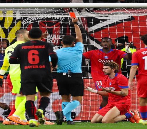 第34分钟,安德里希肘击犯规,收获红牌下场,仅仅过了3分钟,扎巴尔尼禁区内犯规,不仅送出点球,同样也收获红牌下场,短短7分钟,裁判直接罚下两人,确实有点少见。随后,加西亚轻松将点球打入网内,双方战成1-1手,回到同一起跑线。但是接下来的时间就是大巴黎的啦,先是杜埃在禁区内进球,4分钟后,克瓦拉茨赫利亚再下一城,帮助大巴黎将比分扩大到了3-1;上半场补时阶段,埃杜再下一城,完成梅开二度好戏,半场结束,大巴黎4-1领先勒沃库森。