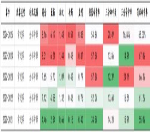 图:近五年新秀中锋进入常规赛后的场均数据变化(%)