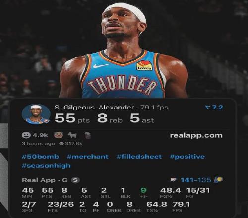 次战,雷霆双加时141-135击败步行者。亚历山大投篮31中15,罚球26中23,狂轰55分8板5助。