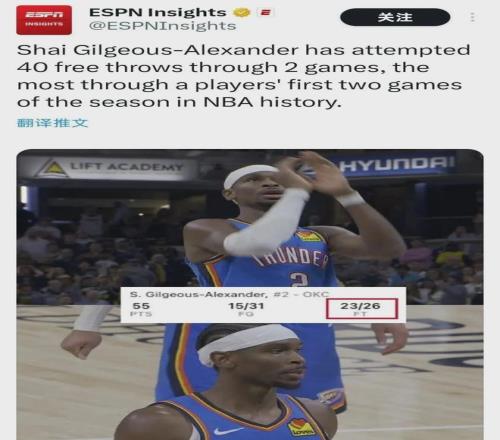 特别值得一提的是,亚历山大在开赛前两场合计40个罚球出手,为NBA史上最多,第二名是兰尼尔&张伯伦的38个。
