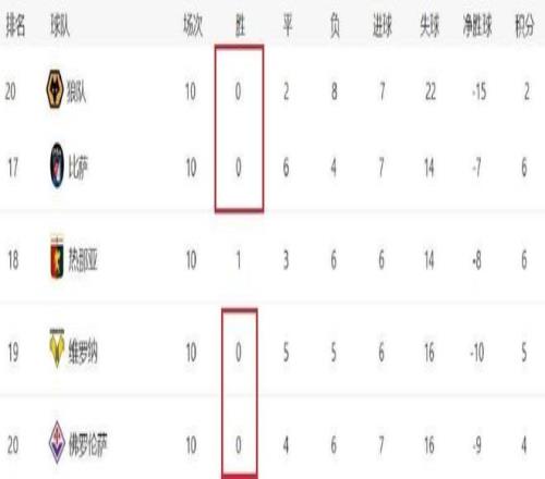 随着热那亚和门兴格拉德巴赫两队成功“上岸”,目前本赛季欧洲五大联赛赛场上,还剩下4支一胜难求的队伍。这四支本赛季欧洲五大联赛中0胜球队,分别是英超的狼队,以及意甲三支球队比萨、维罗纳和佛罗伦萨。