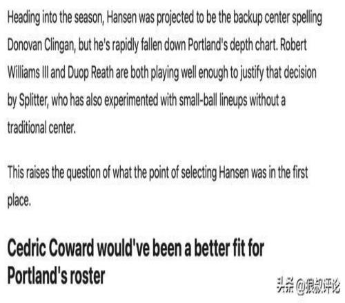赛季开始前,瀚森被认为会是多诺万·克林根的替补中锋,但他迅速跌出了波特兰的轮换阵容。罗威和里斯的表现足以证明斯普利特的决定是正确的,他还经常尝试了无中锋的小球阵容。这就引出了一个问题:当初选择瀚森的意义何在?