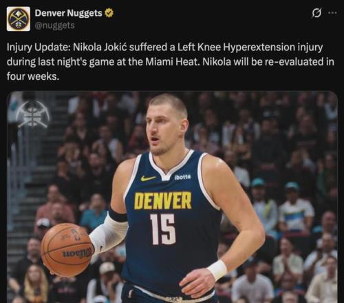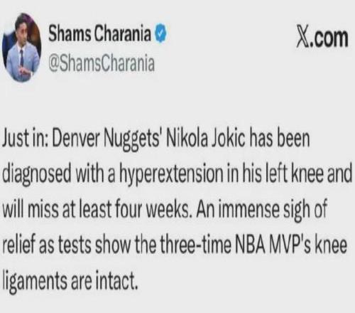 爆料王Shams:约基奇膝盖过度伸展,韧带完好无损,但也需要至少休战四周时间。