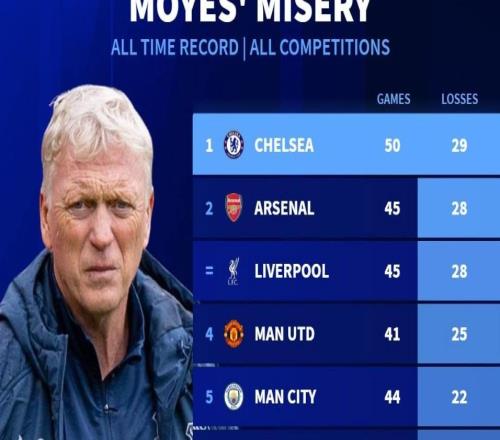 50战29负,切尔西成为莫耶斯教练生涯输球次数最多的对手 -
